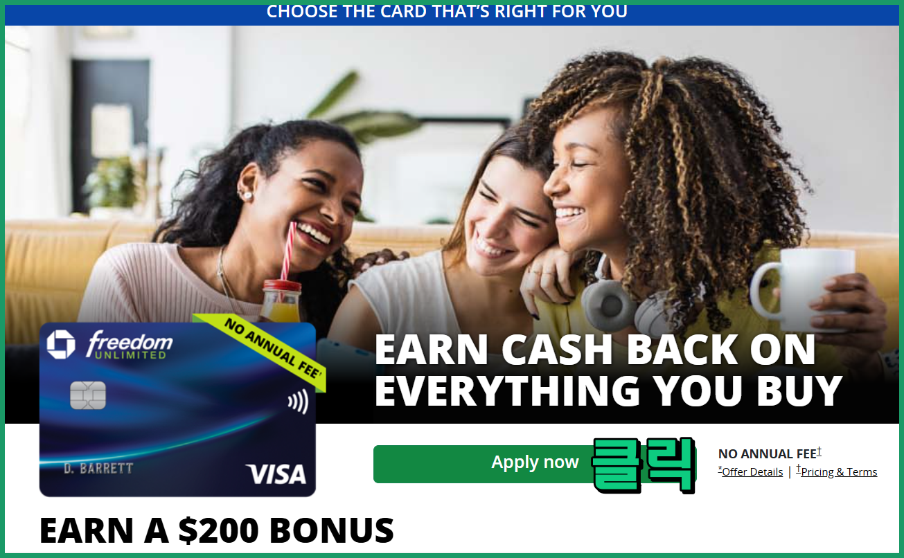 | Chase Freedom Unlimited | $0 | - 첫 3개월내 $500 사용시 $200 페이백 - 모든 구매에 1.5% 적립 - 식사 및 약국 3% 적립 |