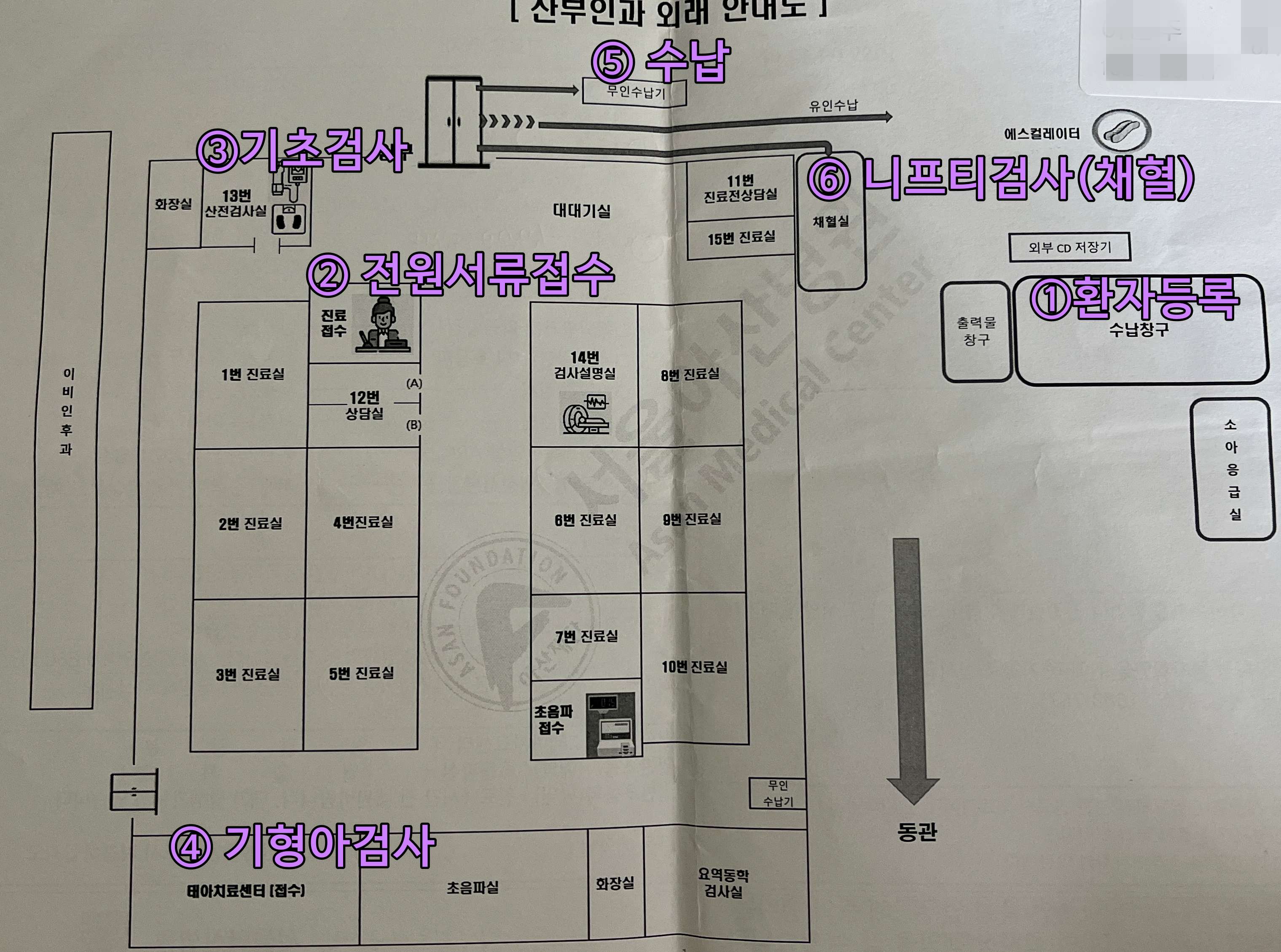 '수납창구'에서 환자등록을 하고, 기형아 1차 검사 비용을 미리 냈다.