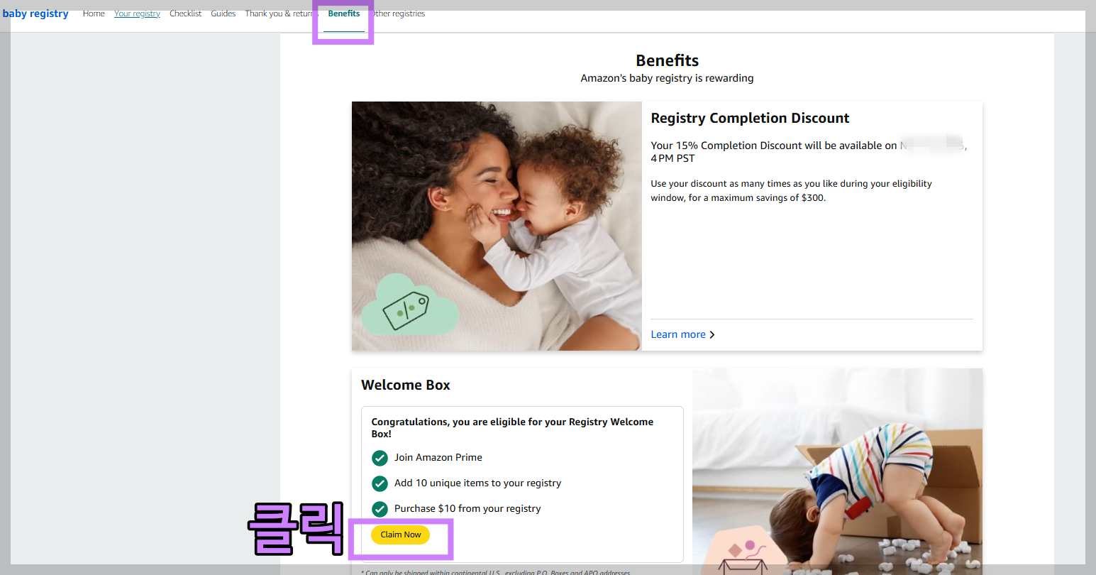 베이비 레지스트리에서 Benefits 클릭하고