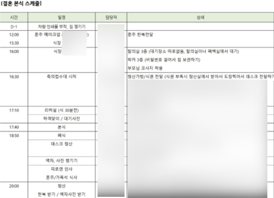 당일에는 너무 정신없고 놓치는 게 생길 수 있으니까 시간순으로 쭉 할 일과 부탁할 것을 적었다