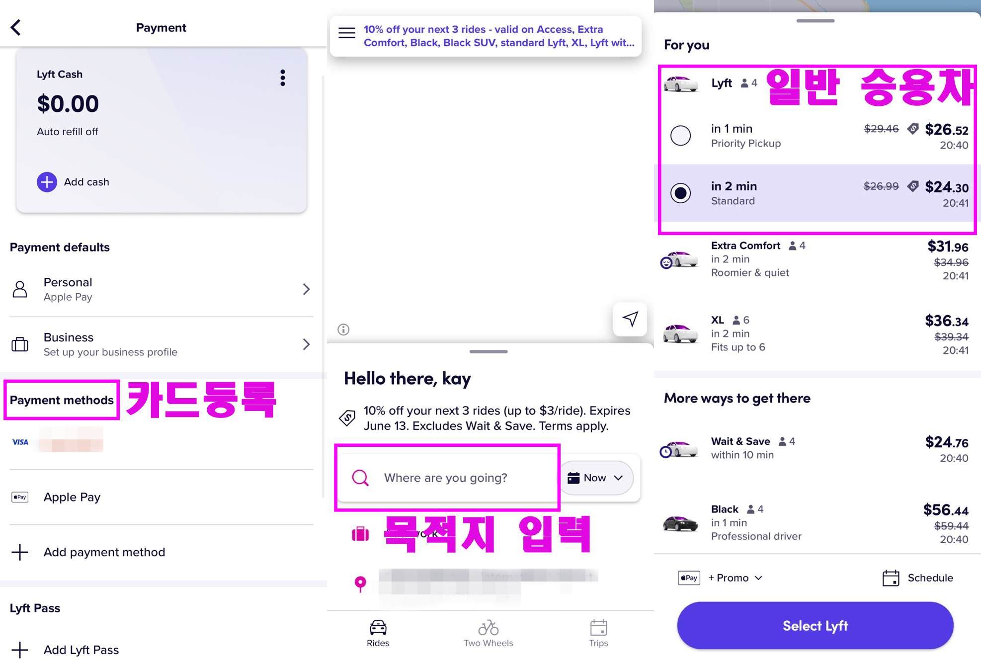 리프트도 우버와 동일하다. 먼저 Lyft 어플을 깔고 가입한 뒤 '카드등록'을 꼭 해줘야 한다.