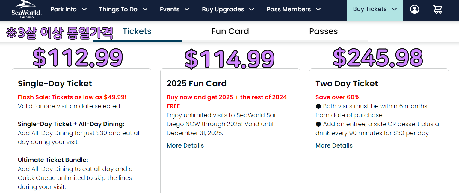 공홈 기준으로 1일권 어른 가격이 112.99불이다. 3살 이상이면 모두 다 같은 가격이다.